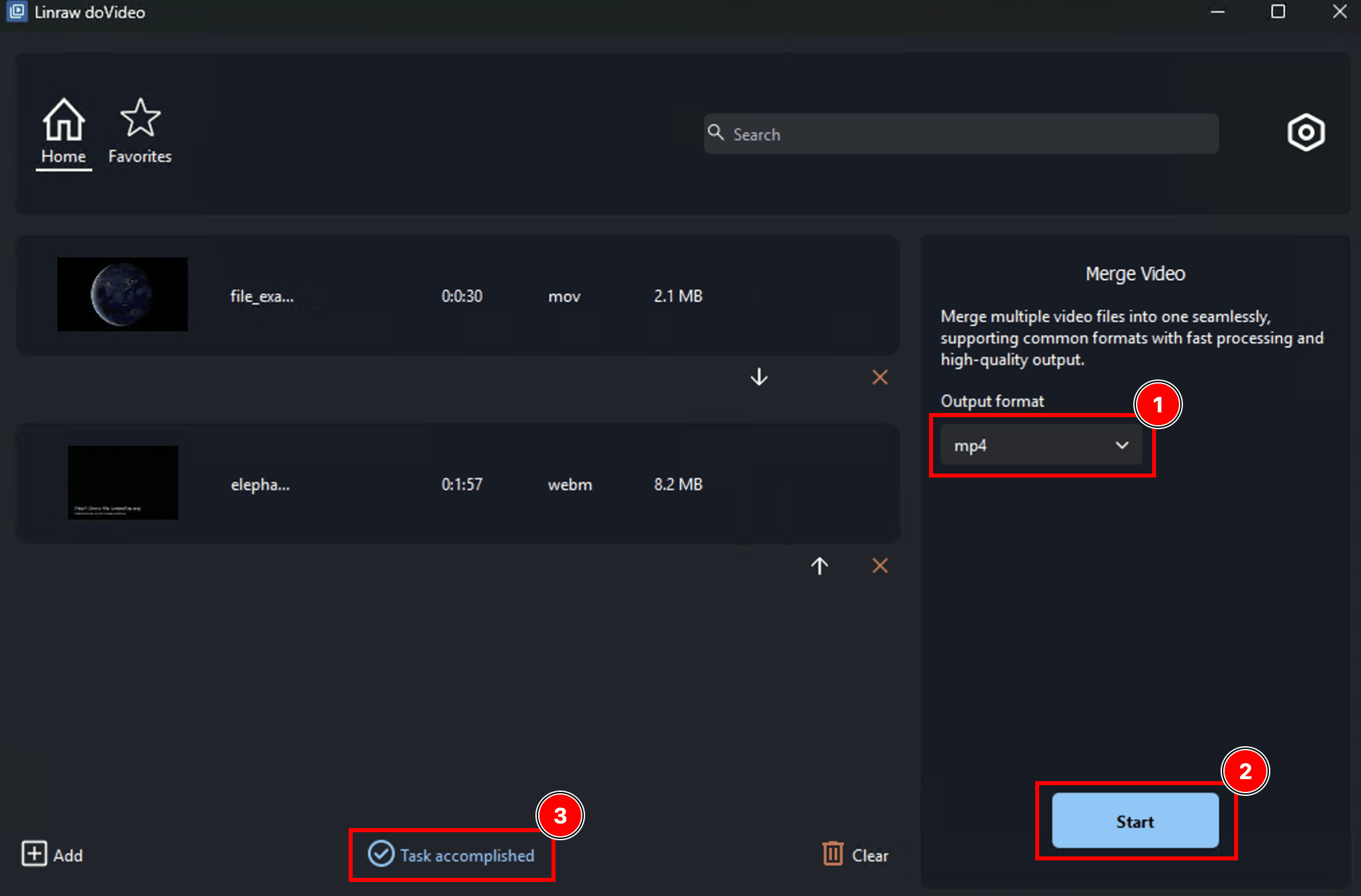 Click “Start” button Linraw doVideo processes everything in one go and saves the combined video to your chosen folder.